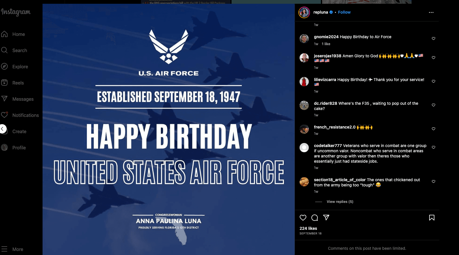 “Happy Birthday United States Air Force! As an Air Force Veteran myself, I’m especially thankful for everything I learned while serving in this incredible branch of our Armed Forces,” Luna, an influencer on Instagram before being elected to Congress last year, wrote on her posts.