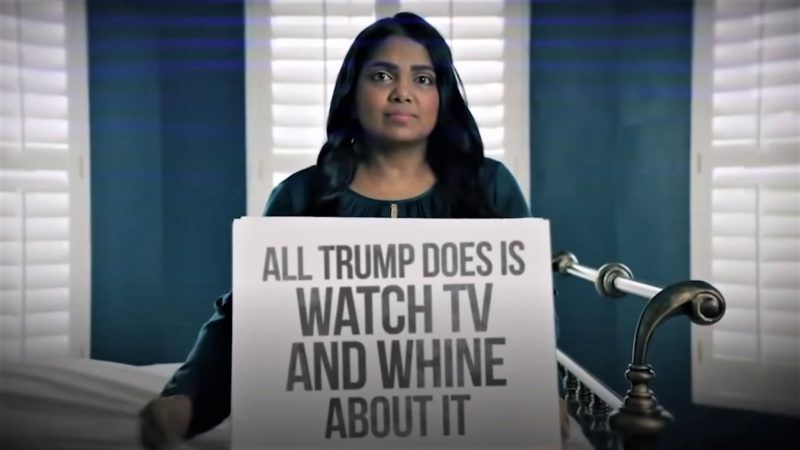 Instead of featuring the anti-Biden messages, the ad changes the text of the cards to a series of messages slamming the president for his handling of the COVID-19 pandemic.