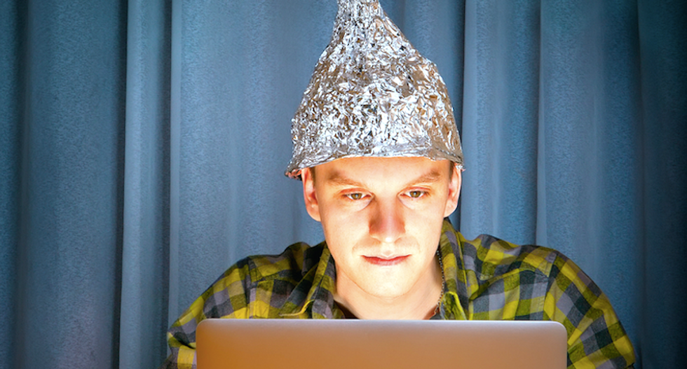 Conspiracy theorist wearing tinfoil hat stares at his computer (Shutterstock)