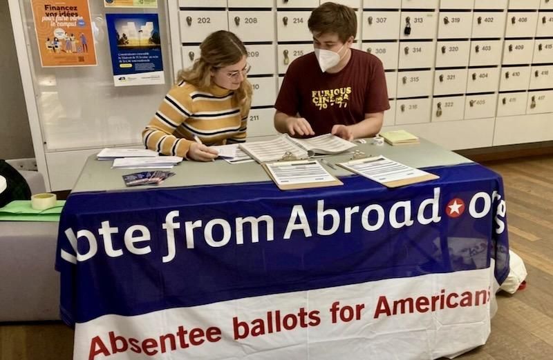 Volunteers with Vote from Abroad help US citizens register to vote for the 2022 midterm elections. © Mariamne Everett, France 24