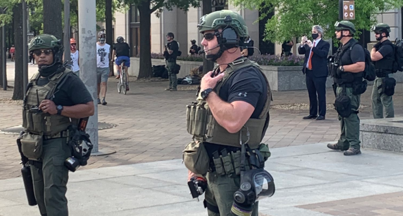 On Tuesday, Mother Jones national security reporter Dan Friedman posted an image of heavily-armed federal officials overseeing protests in D.C. — and noted that they refused to identify their agency when asked.