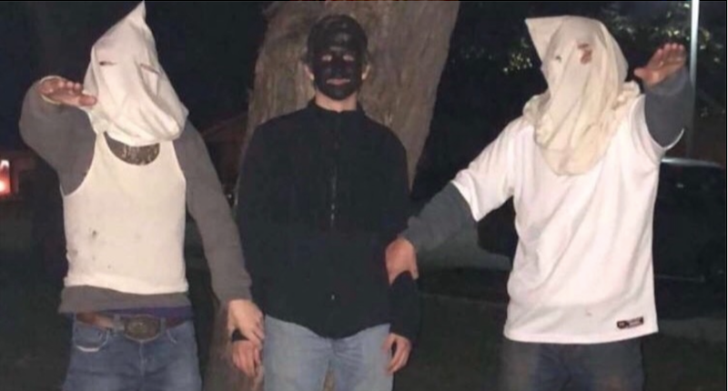 The image shows two students in KKK robes, displaying a Nazi salute. The conceit of the costume appears to be that the Klansman have apprehended a black man—that's the third student, who's in blackface.