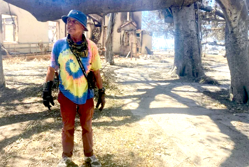 Anthony Garcia stands under a charred banyan tree -- the spiritual center of Lahaina -- in the aftermath of a wildfire that devastated the historic Hawaiian town (Paula RAMON)