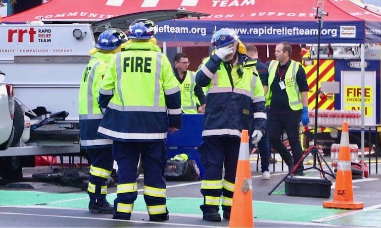 Emergency responders work outside the Loafers Lodge hostel in Wellington, where at least six people were killed in a fire on Tuesday © Marty MELVILLE / AFP
