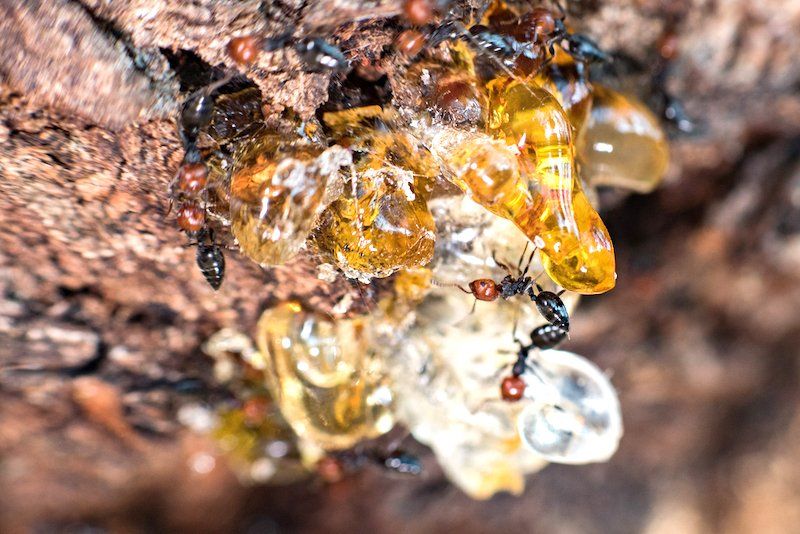 The repletes are fed by other members of the colony, who forage for nectar and honeydew in the environment. The repletes accumulate a golden honey-like substance in their flexible abdomens.