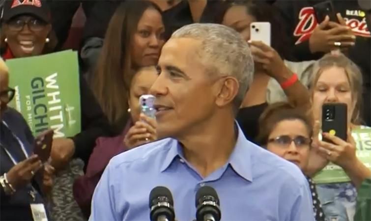 As the former two-term president ridiculed Whitmer's opponent, Tudor Dixon, among other Republican Party candidates, Obama was interrupted and proceeded to talk over his critic as the crowd laughed and chanted "Obama" repeatedly.