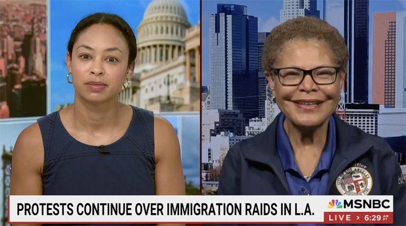 Invited on to discuss the success of the curfew she set imposed on the city on Tuesday night, which was largely successful, Gay prompted Bass with, "Mayor, have you received any kind of communication from the federal government about or even the state government about what you can expect from the hundreds of marines who are in Los Angeles right now and what their mission is," before pausing as Bass laughed and saying, "go ahead."