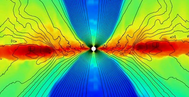 The simulation, which produces a disk with two jets of gas and magnetic fields protruding from the centre like fountains, shows the inner part of the accretion disk aligning perfectly with the black hole's equator even as the outer part remains at an angle.