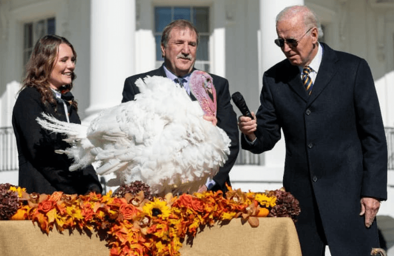 A US presidential pardon of a turkey is a Thanksgiving tradition -- here, Joe Biden (R) does the honors for Chocolate