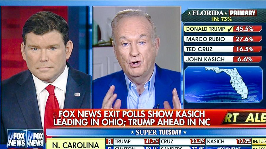 "It was no surprise that Trump won in Florida," O'Reilly told Fox News anchor Bret Baier moments after the network called the state for the Republican billionaire. "The reason I think that Trump won in Florida is because he comes across as more authoritarian -- not authoritative -- authoritarian."