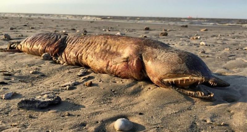 The National Audubon Society's social media manager tweeted photos of the lifeless body on the beach near Galveston. The creature was faceless except for strange fangs protruding.