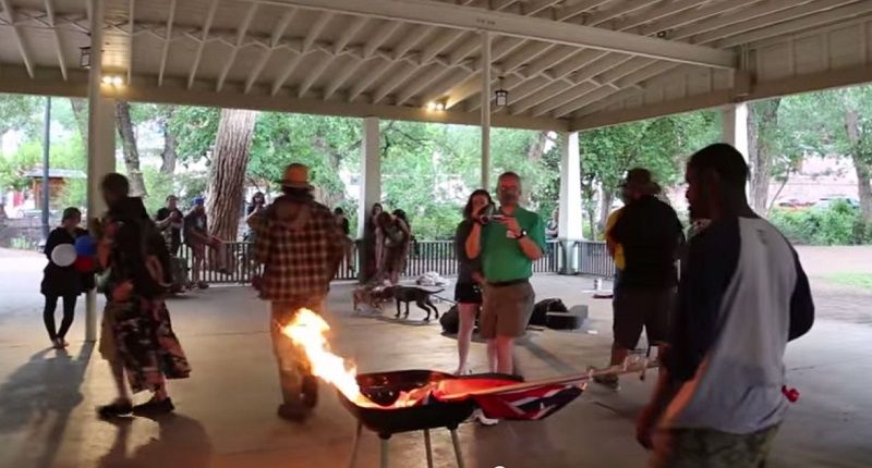 Protesters burn the Confederate flag at Soda Springs Park (Screenshot/YouTube)
