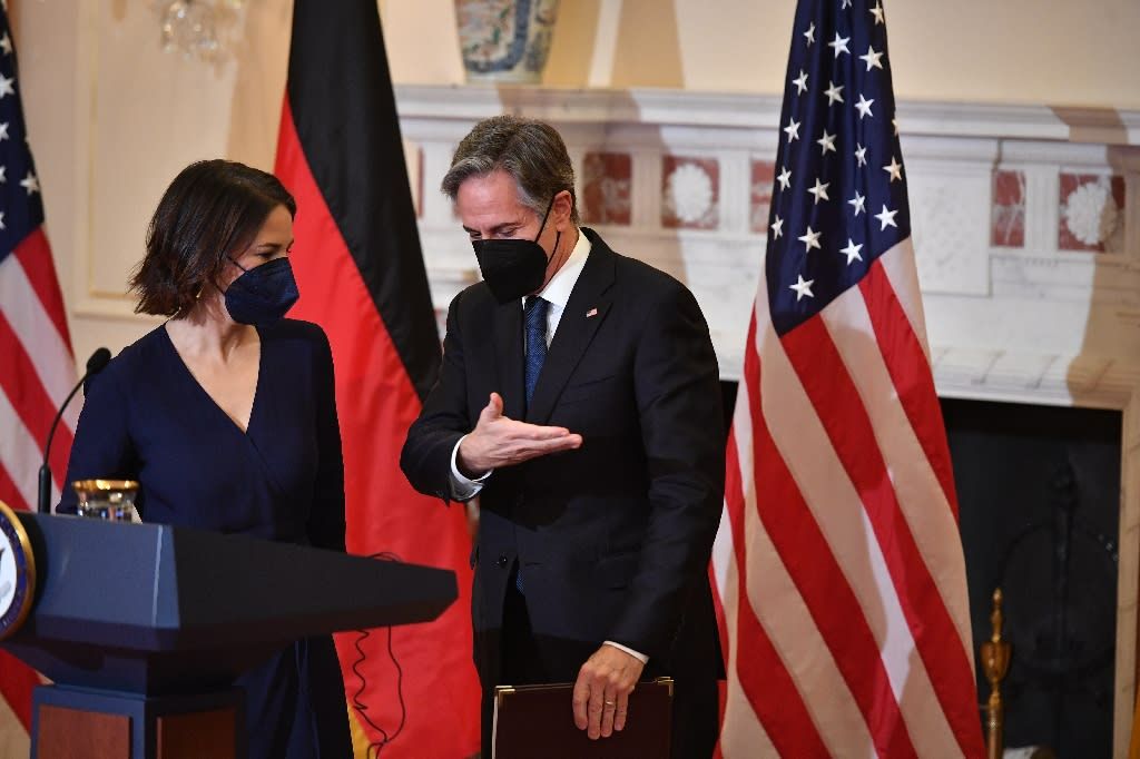US Secretary of State Antony Blinken and German Foreign Minister Annalena Baerbock leave after speaking to the press in Washington