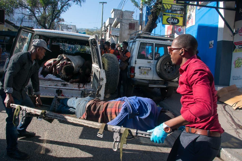 Paramedics carry the body of a person killed by gang members in Petionville, Port-au-Prince, Haiti