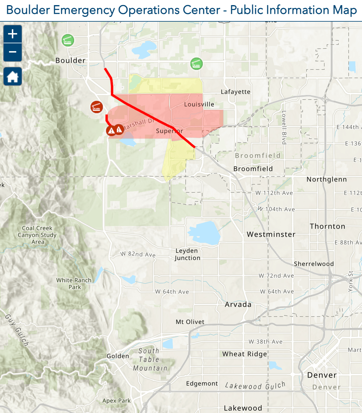 Map of the fire, with Boulder in the Northwest corner and downtown Denver in the Southeast corner: