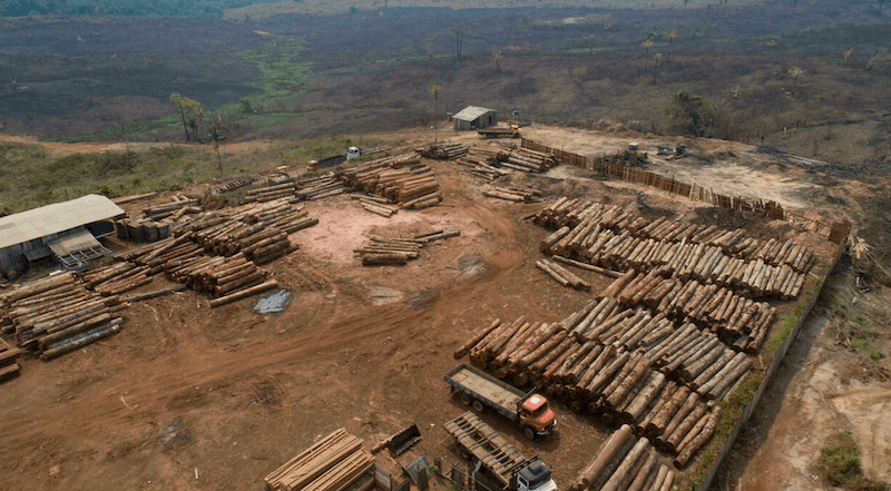 A lumber mill with stacks of logs near recently deforested fields near Porto Velho in Rondonia state, Brazil, September 2, 2019. © Andre Penner, AP