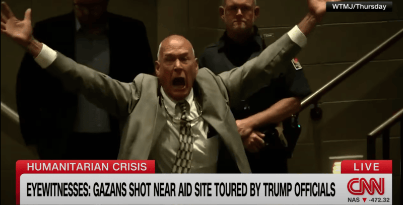 “Two million people in Gaza are starving!" a constituent shouts at the lawmaker. "What do you have to say about that?!"