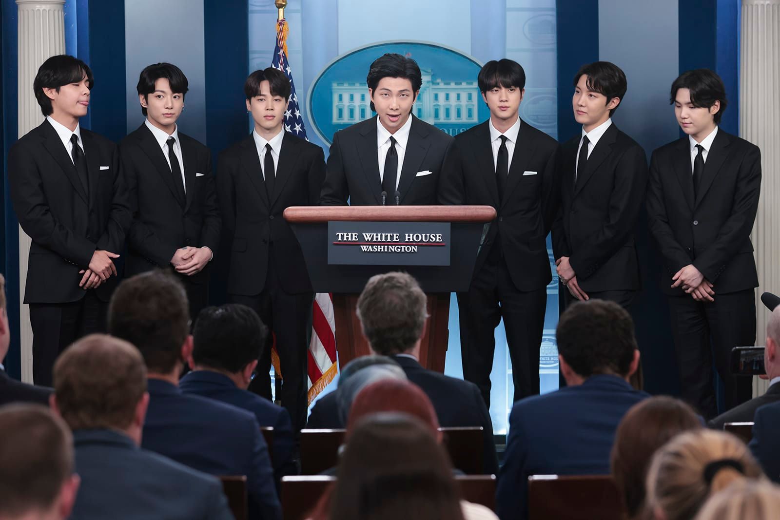 Members of the K-Pop band BTS speak during the during a daily press briefing in the James S. Brady Press Briefing Room at the White House in Washington, DC on May 31, 2022. - Oliver Contreras/Pool via CNP/Zuma Press/TNS