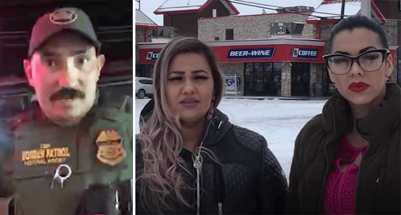Composite image, a Border Patrol agent in Havre, MT and Mimi Hernandez and Ana Suda (screengrabs).