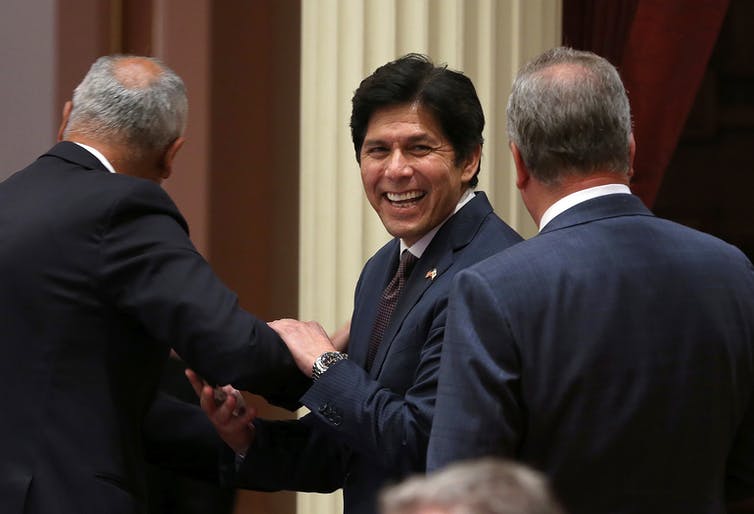 California State Sen. Kevin de Leon, celebrating after his colleagues approved the zero-carbon energy bill he championed for two years.