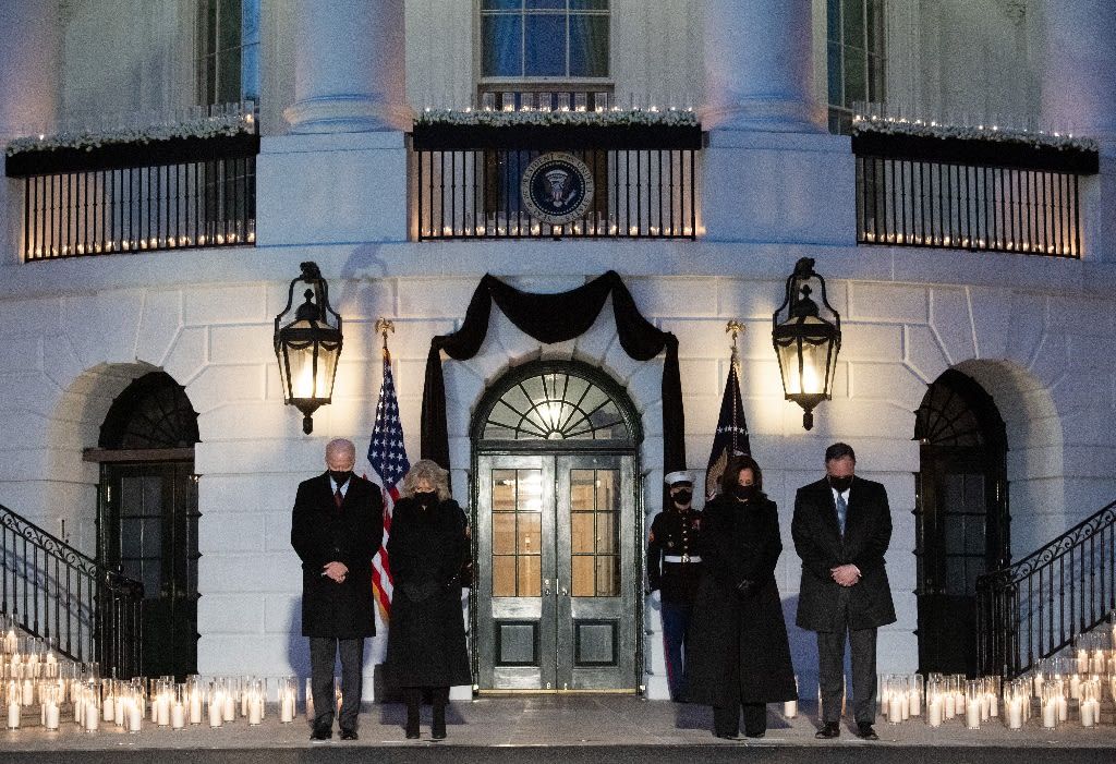 President Joe Biden (left), with First Lady Jill Biden, Vice President Kamala Harris and her husband Doug Emhoff mark a moment of silence to 500,000 Americans killed by Covid-19, at the White House on 22 February 2021