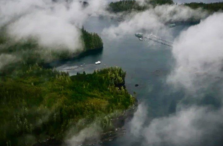 An aerial image shows fish farming in the waterways of the Great Bear Sea north of Vancouver Island (Patrick T. Fallon/AFP)