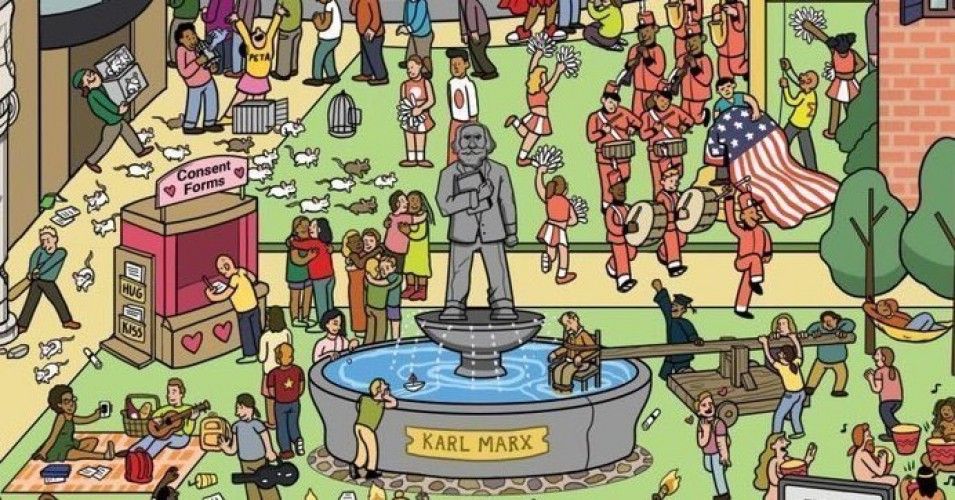 The work in question was created by New York-based artist and illustrator Chelsea Saunders and appeared in the November-December 2018 issue of Current Affairs. It depicts a satirical campus that includes a stadium for "Oppression Olympics," pronoun police dragging someone away, a College of Grievance Studies building, a Karl Marx fountain, and a banner that says, "Friendly reminder: it's not OK to be white."