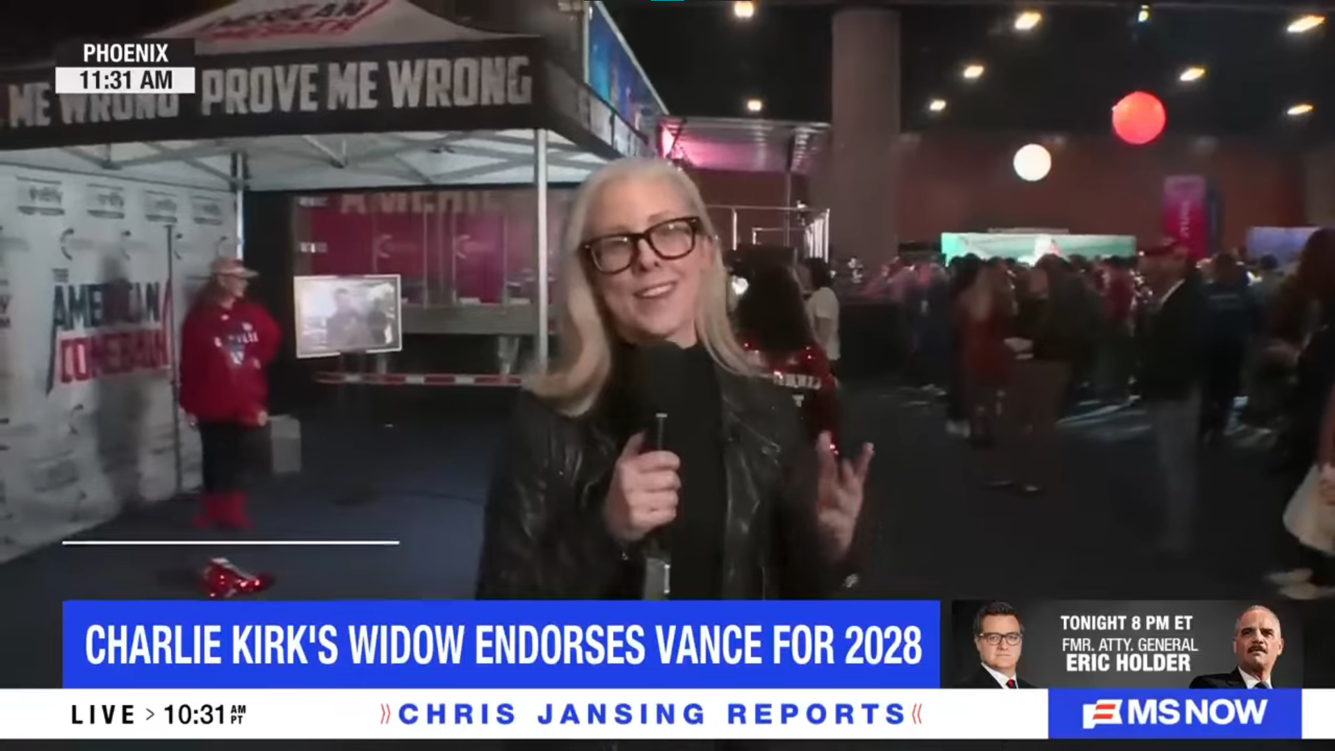 MS NOW was present at the Turning Point USA event – its annual America Fest conference in Phoenix, Arizona – and documented the recreation of Kirk’s assassination site.