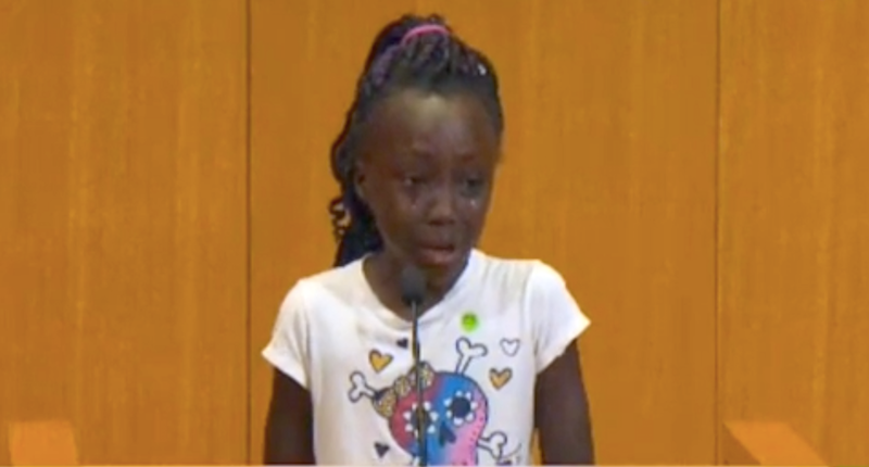 A child tearfully addressed the meeting, mourning the black residents killed in police encounters.