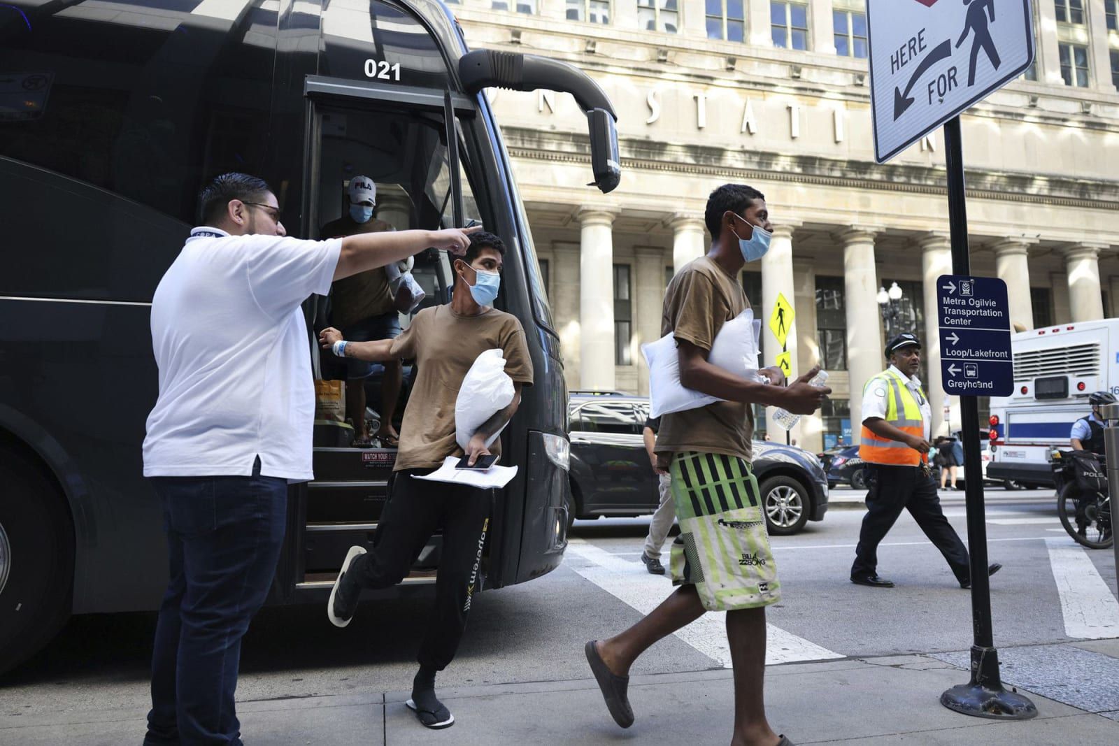 Migrants are led from one bus to another after arriving from Texas at Union Station on Sept. 9, 2022, in Chicago. - Chris Sweda/Chicago Tribune/TNS