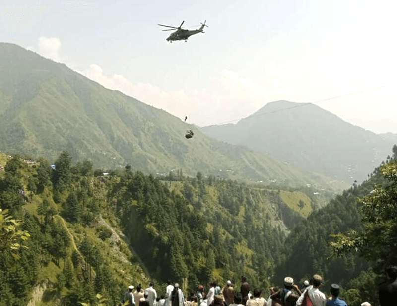 Several military helicopters flew reconnaissance sorties and an airman was lowered by harness to deliver food, water and medicine, Tanveer Ur Rehman, a local government official, told AFP.