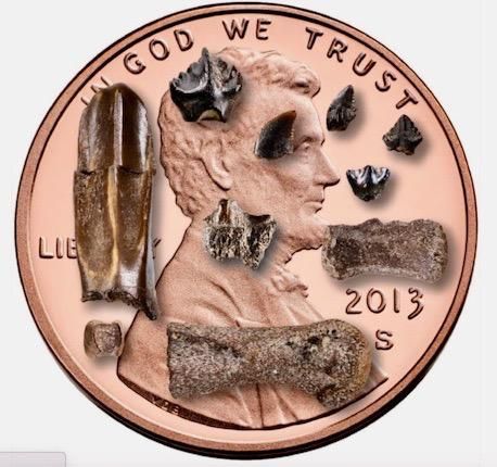 Baby dinosaur bones and teeth from the Prince Creek Formation in northern Alaska are seen against a US penny