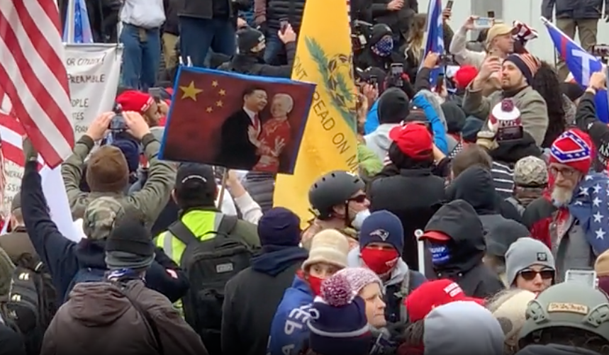 Alongside the MAGA, Gadsden, "America First" and Kekistan flags, the Trump supporters who swarmed around the Capitol on Jan. 6 also carried homemade signs portraying Biden as a stooge of China. "Beijing Biden is CCP loyalist," read one, while another showing a feeble-looking Biden in the embrace with Chinese President Xi Jinping.