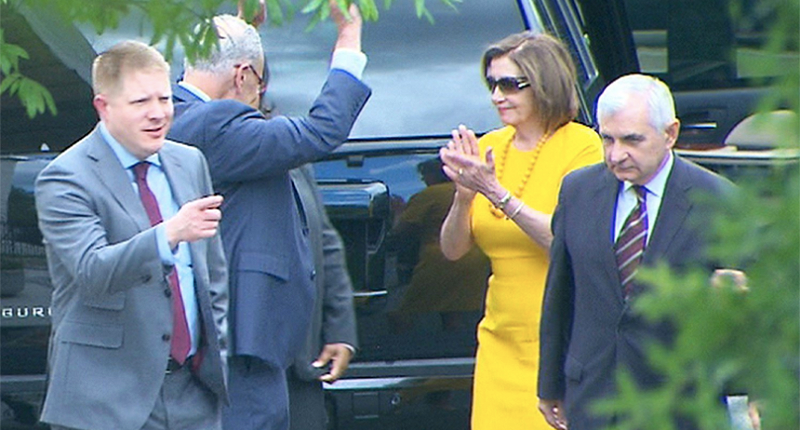 Sen. Chuck Schumer (D-NY) and House Speaker Nancy Pelosi were caught on video doing a strange motion after their meeting at the White House with President Donald Trump over the Iran conflict.