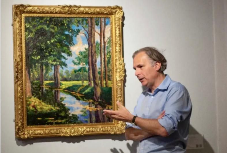 Jean-Paul Engelen, Deputy Chairman of Phillips auction house, speaks next to The Moat, Breccles," a signed 1921 oil landscape by Winston Churchill (AFP)