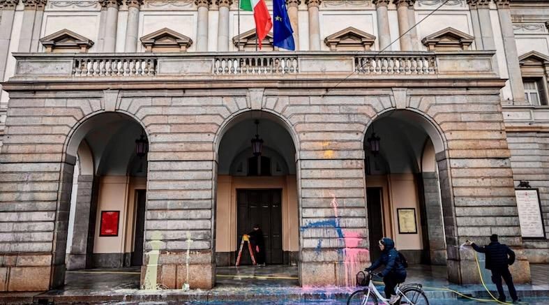Environmental activists hurled paint at the entrance of Milan's prestigious La Scala opera house on Wednesday, part of a series of recent protests across Europe to focus attention on climate change.