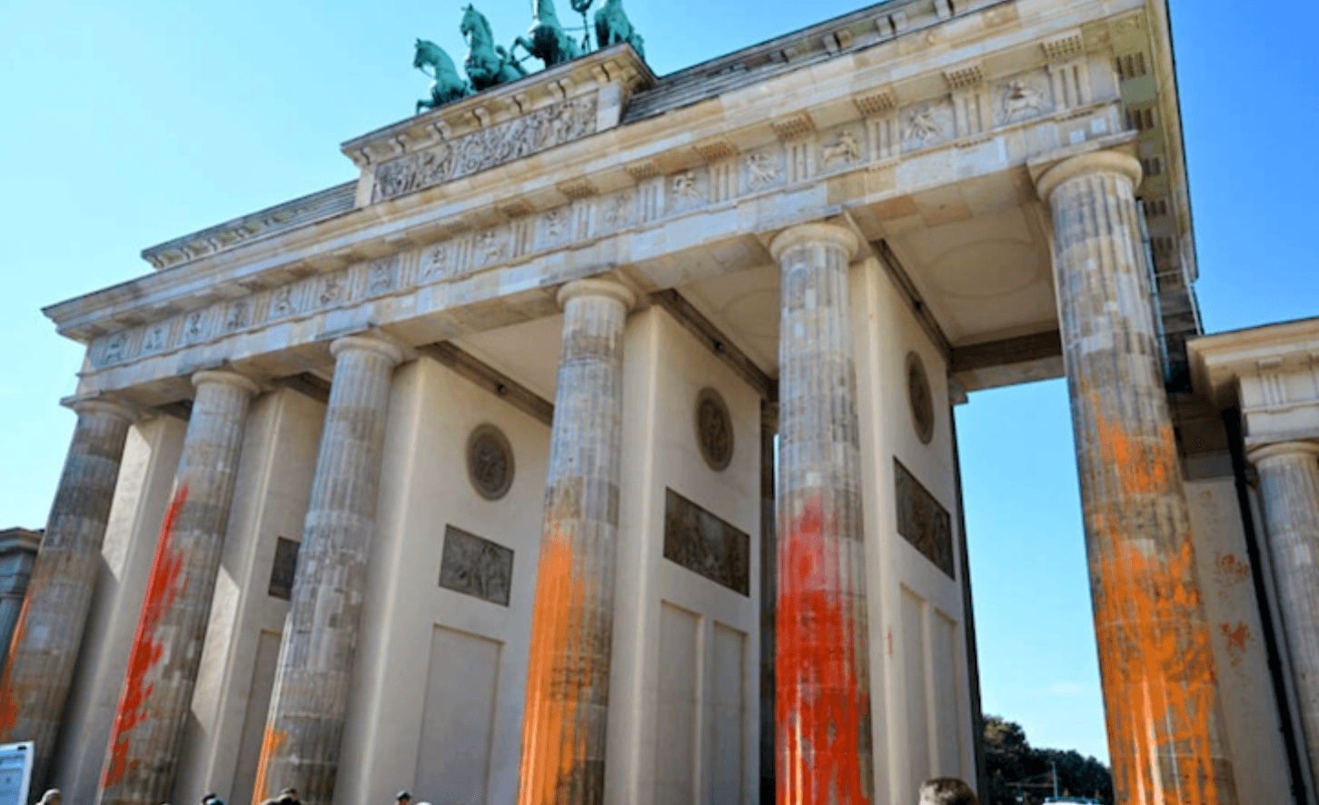 Six pillars of the monument at the heart of the German capital were sprayed with orange warning paint, the group said in a statement.