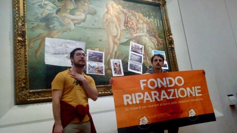 Italian activists on Tuesday stuck photographs of climate change devastation to a glass panel protecting Botticelli's famed Birth of Venus painting at the Uffizi museum in Florence.