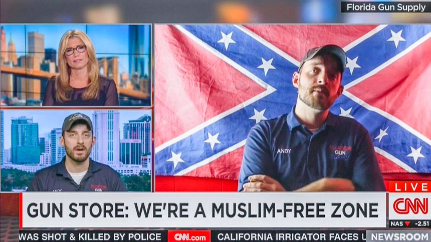 In a video posted to YouTube following a recent shooting at military recruiting offices in Chattanooga, Florida Gun Supply owner Andy Hallinan appeared in front of a Confederate flag and declared that his store was a "Muslim-free zone."