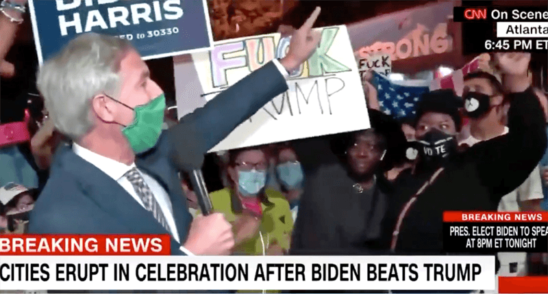 With a chyron reading, "cities erupt in celebration after Biden beats Trump" the reporter was giving a live update from Atlanta.