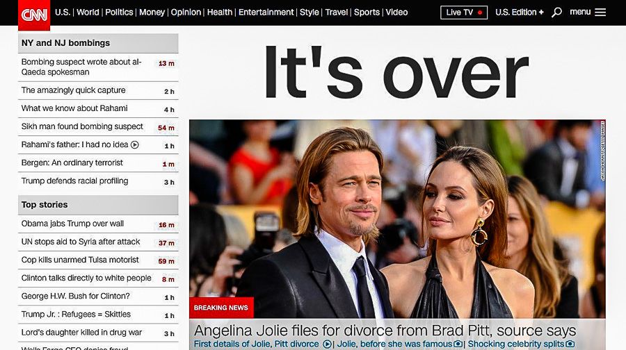 CNN.com headline reports Angelina Jolie and Brad Pitt filed for divorce (screen grab)
