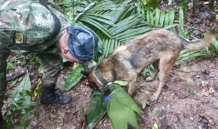 A photograph released by Colombia's armed forces shows soldiers and sniffer dogs searching for the missing children© Handout / Colombian army/AFP