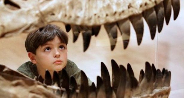 A boy inspects the teeth of a dinosaur at an exhibition in Melbourne on May 29,2008.-AFP