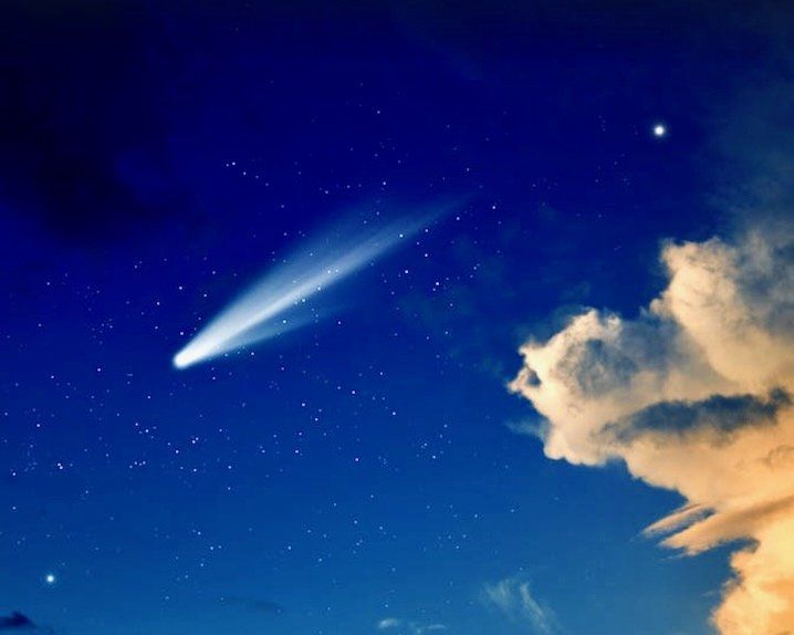 Comet Hale-Bopp as seen from Earth in 1997. The blue ion tail is visible to the top left of the comet. Philipp Salzgeber, CC BY-ND