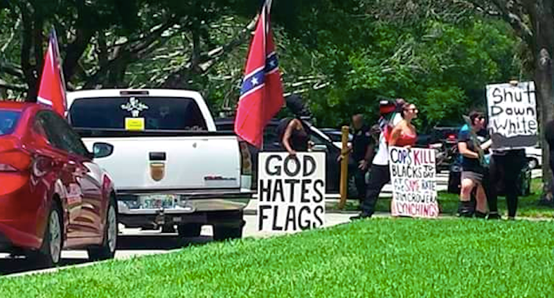 "They don't realize this is a rebellious flag," said a protester who identified himself as St. James. "The reason all those states seceded was to keep slavery, and the more they hold up these flags, the more they're showing that's what they want: They want slavery, they want racism to be in his town."