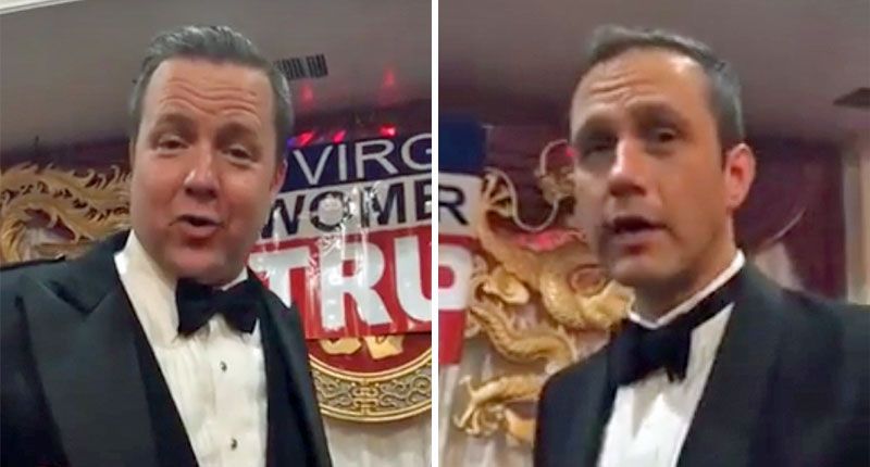 "Now we need you to win Virginia," Nehlen, also wearing a tuxedo, says to Stewart in the video.