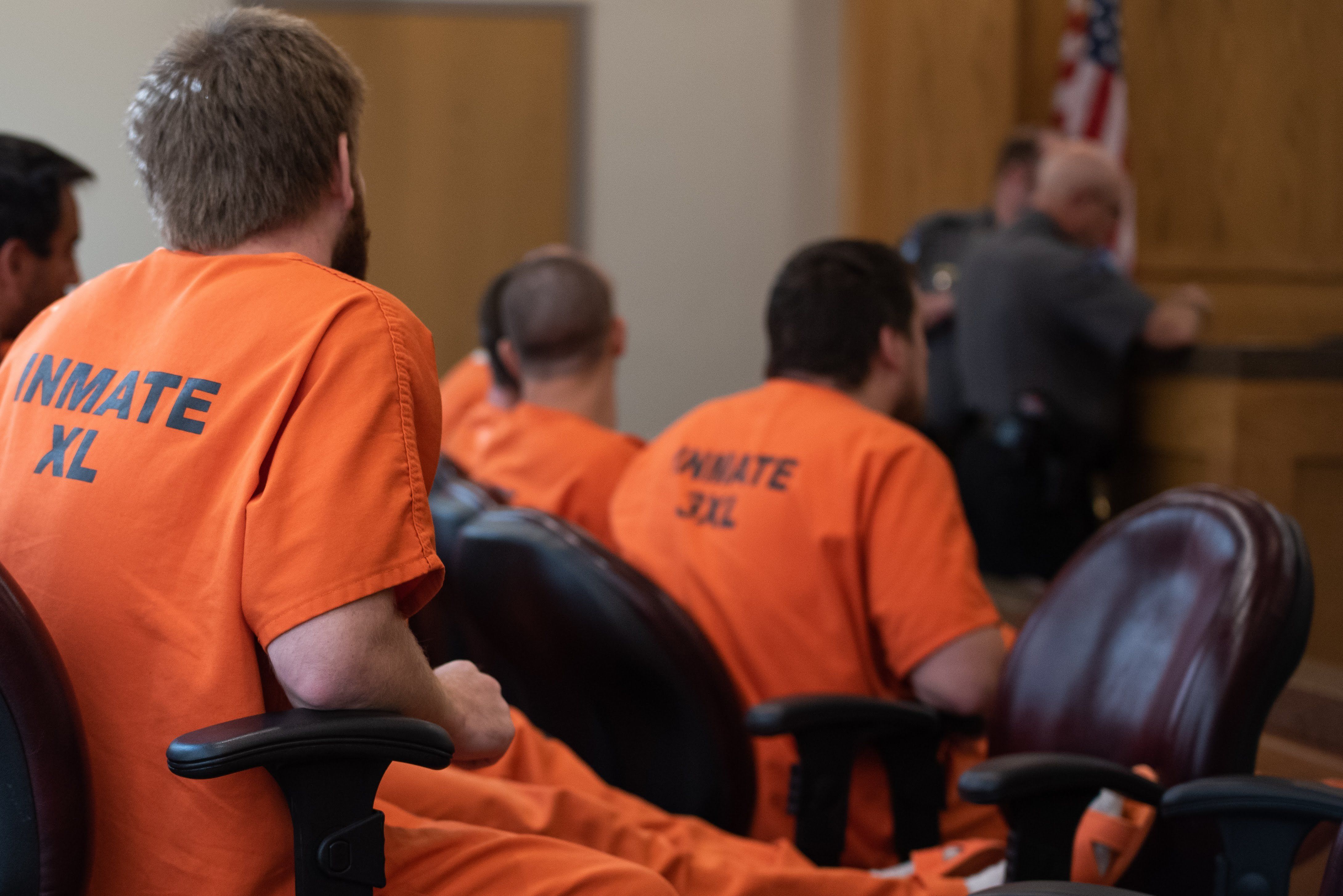 Inmates are seen in a jury box during court proceedings in an Oklahoma courtroom. Whitney Bryen/Oklahoma Watch