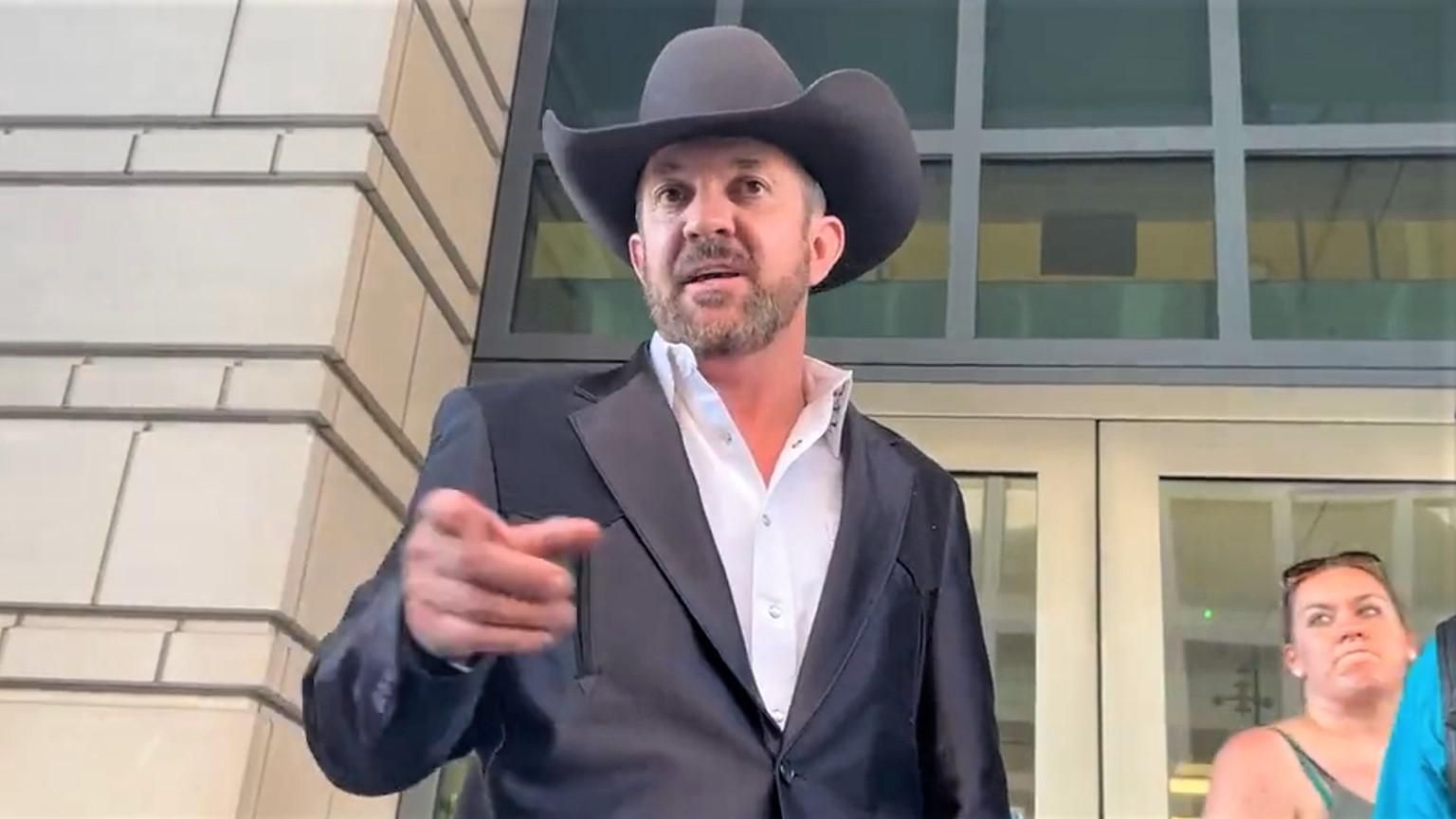 Couy Griffin, the MAGA-rioting founder of "Cowboys for Trump," went on a long rant against CBS News reporter Scott MacFarlane on Monday while standing outside the courtroom after the first day of his trial.