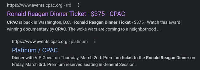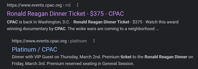Back to tonight’s Reagan dinner. It’s a CPAC staple, because of the elbow rubbing — not because of the fine dining.