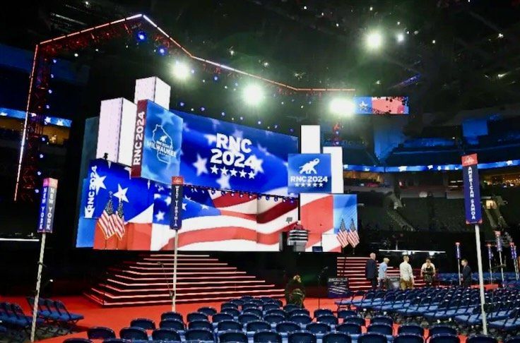A view of the convention floor and stage ahead of the 2024 Republican Convention at the Fiserv Forum in Milwaukee, Wisconsin (AFP)